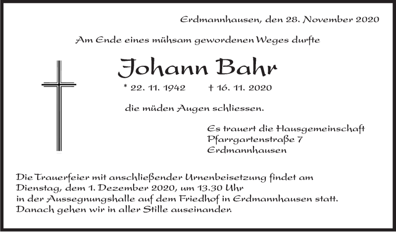Hier finden Sie alle Traueranzeigen aus der Zeitung, die bisher für Johann Bahr erschienen sind. Weitere Traueranzeigen, die in der Zeitung erscheinen, werden hier ebenfalls aufgelistet
