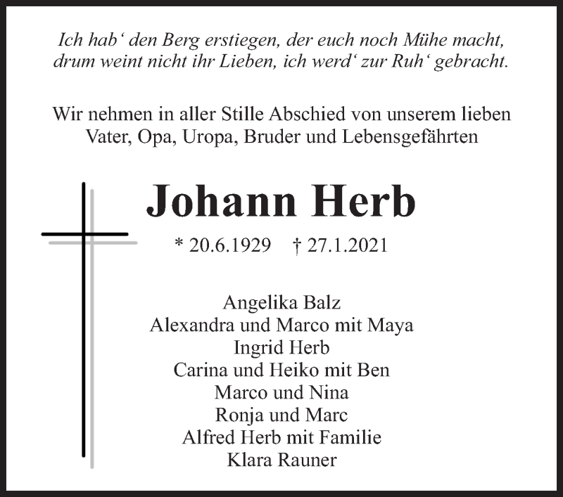 Hier finden Sie alle Traueranzeigen aus der Zeitung, die bisher für Johann Herb erschienen sind. Weitere Traueranzeigen, die in der Zeitung erscheinen, werden hier ebenfalls aufgelistet