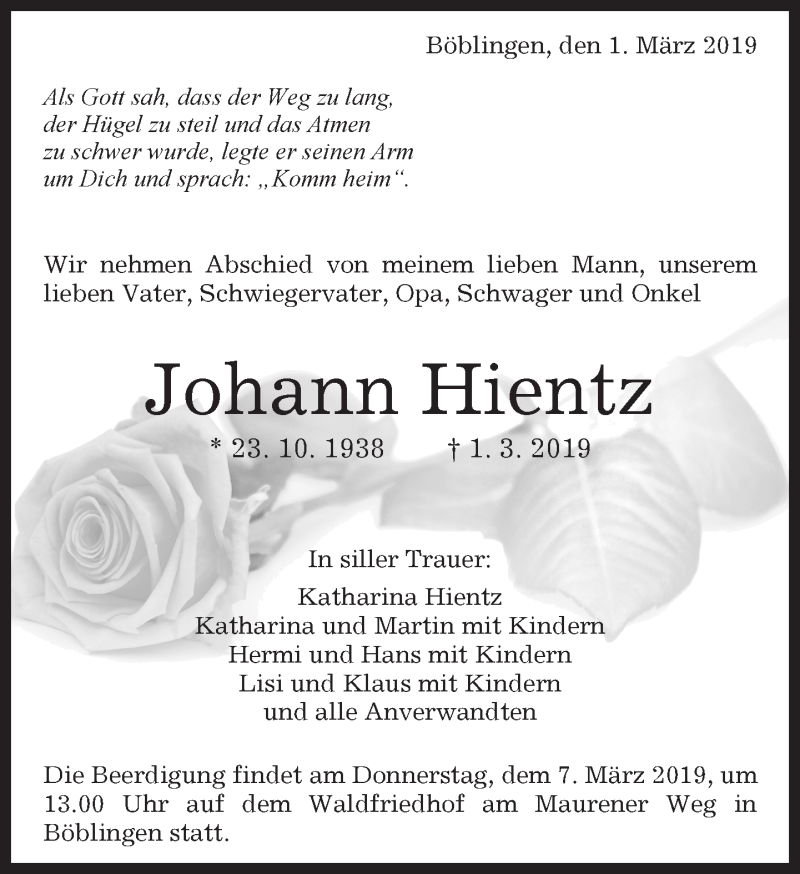 Hier finden Sie alle Traueranzeigen aus der Zeitung, die bisher für Johann Hientz erschienen sind. Weitere Traueranzeigen, die in der Zeitung erscheinen, werden hier ebenfalls aufgelistet