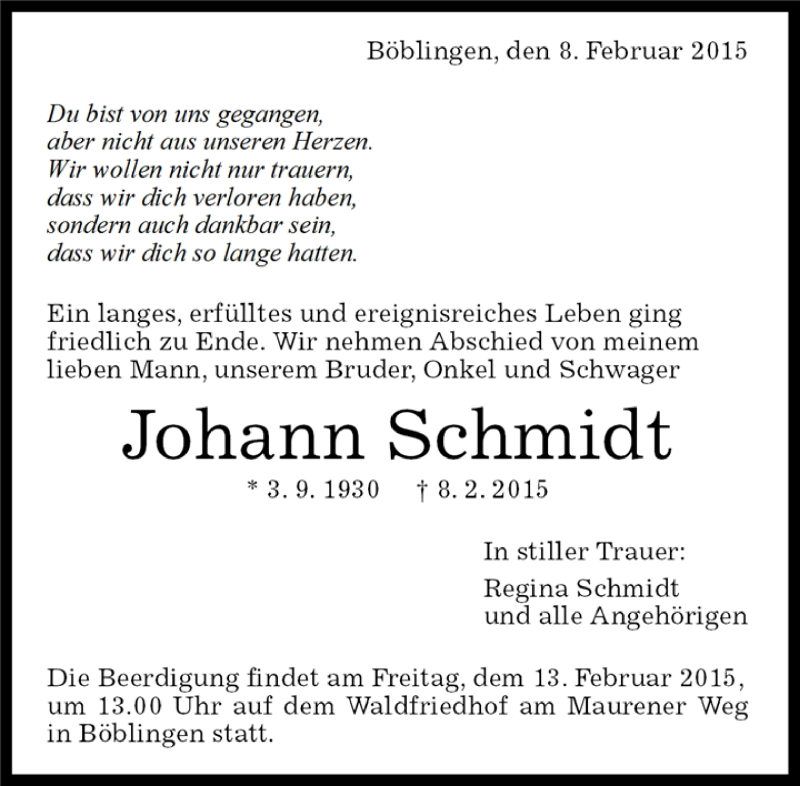 Hier finden Sie alle Traueranzeigen aus der Zeitung, die bisher für Johann Schmidt erschienen sind. Weitere Traueranzeigen, die in der Zeitung erscheinen, werden hier ebenfalls aufgelistet