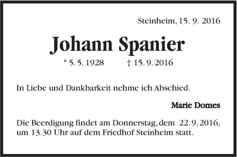 Hier finden Sie alle Traueranzeigen aus der Zeitung, die bisher für Johann Spanier erschienen sind. Weitere Traueranzeigen, die in der Zeitung erscheinen, werden hier ebenfalls aufgelistet
