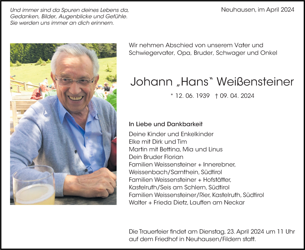 Hier finden Sie alle Traueranzeigen aus der Zeitung, die bisher für Johann Weißensteiner erschienen sind. Weitere Traueranzeigen, die in der Zeitung erscheinen, werden hier ebenfalls aufgelistet
