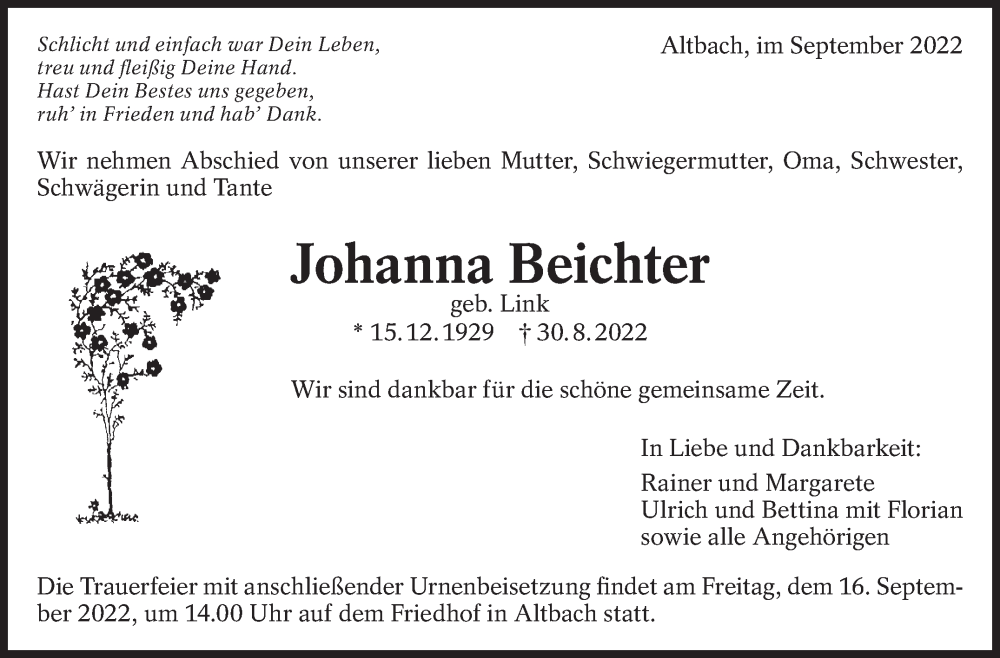 Hier finden Sie alle Traueranzeigen aus der Zeitung, die bisher für Johanna Beichter erschienen sind. Weitere Traueranzeigen, die in der Zeitung erscheinen, werden hier ebenfalls aufgelistet