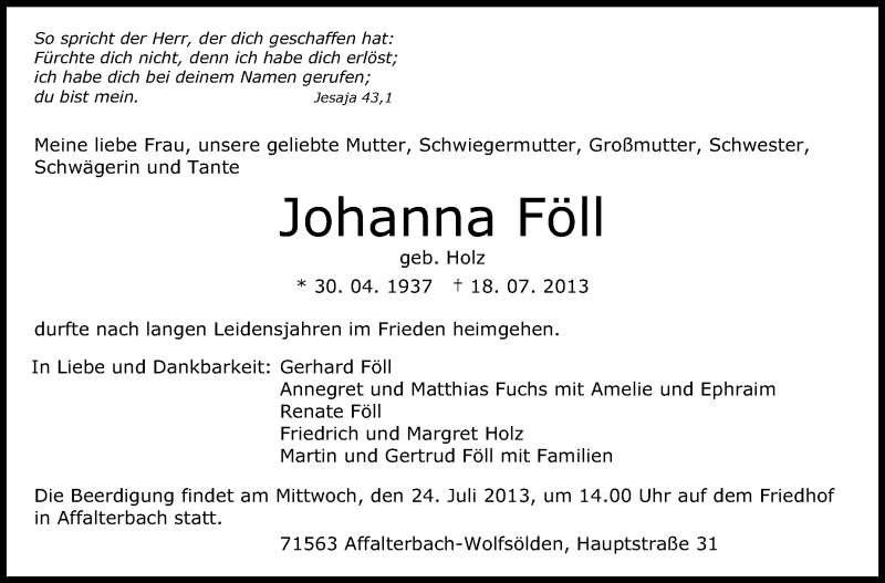 Hier finden Sie alle Traueranzeigen aus der Zeitung, die bisher für Johanna Föll erschienen sind. Weitere Traueranzeigen, die in der Zeitung erscheinen, werden hier ebenfalls aufgelistet