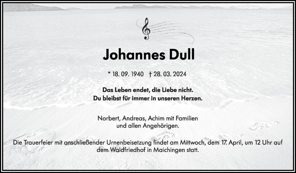 Hier finden Sie alle Traueranzeigen aus der Zeitung, die bisher für Johannes Dull erschienen sind. Weitere Traueranzeigen, die in der Zeitung erscheinen, werden hier ebenfalls aufgelistet