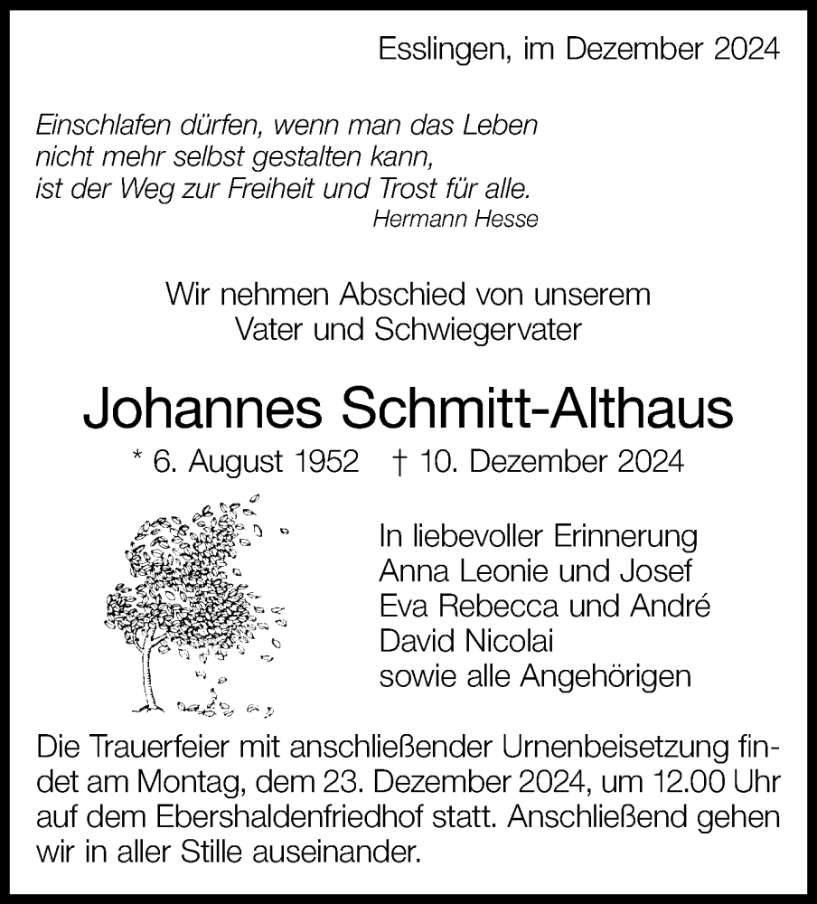 Hier finden Sie alle Traueranzeigen aus der Zeitung, die bisher für Johannes Schmitt-Althaus erschienen sind. Weitere Traueranzeigen, die in der Zeitung erscheinen, werden hier ebenfalls aufgelistet