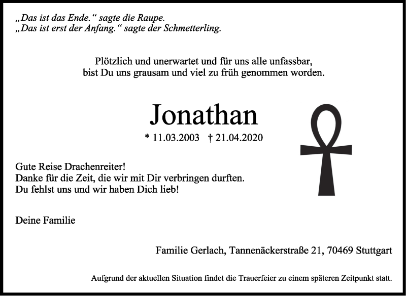 Hier finden Sie alle Traueranzeigen aus der Zeitung, die bisher für Jonathan erschienen sind. Weitere Traueranzeigen, die in der Zeitung erscheinen, werden hier ebenfalls aufgelistet