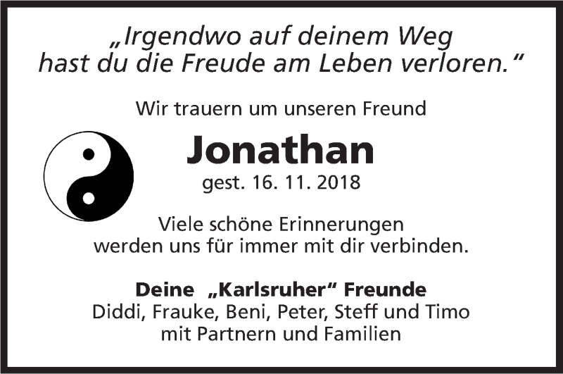 Hier finden Sie alle Traueranzeigen aus der Zeitung, die bisher für Jonathan erschienen sind. Weitere Traueranzeigen, die in der Zeitung erscheinen, werden hier ebenfalls aufgelistet