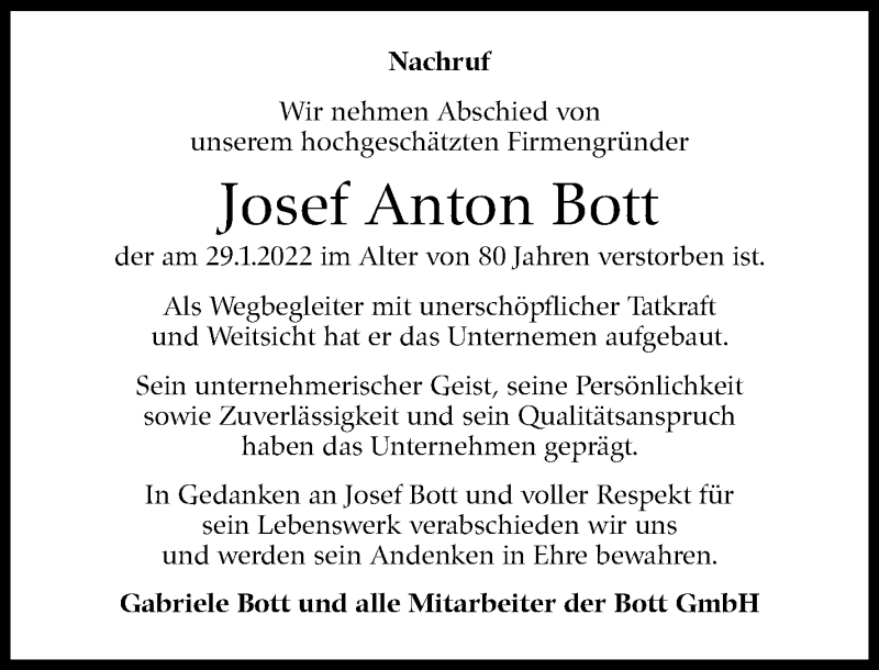 Hier finden Sie alle Traueranzeigen aus der Zeitung, die bisher für Josef Anton Bott erschienen sind. Weitere Traueranzeigen, die in der Zeitung erscheinen, werden hier ebenfalls aufgelistet