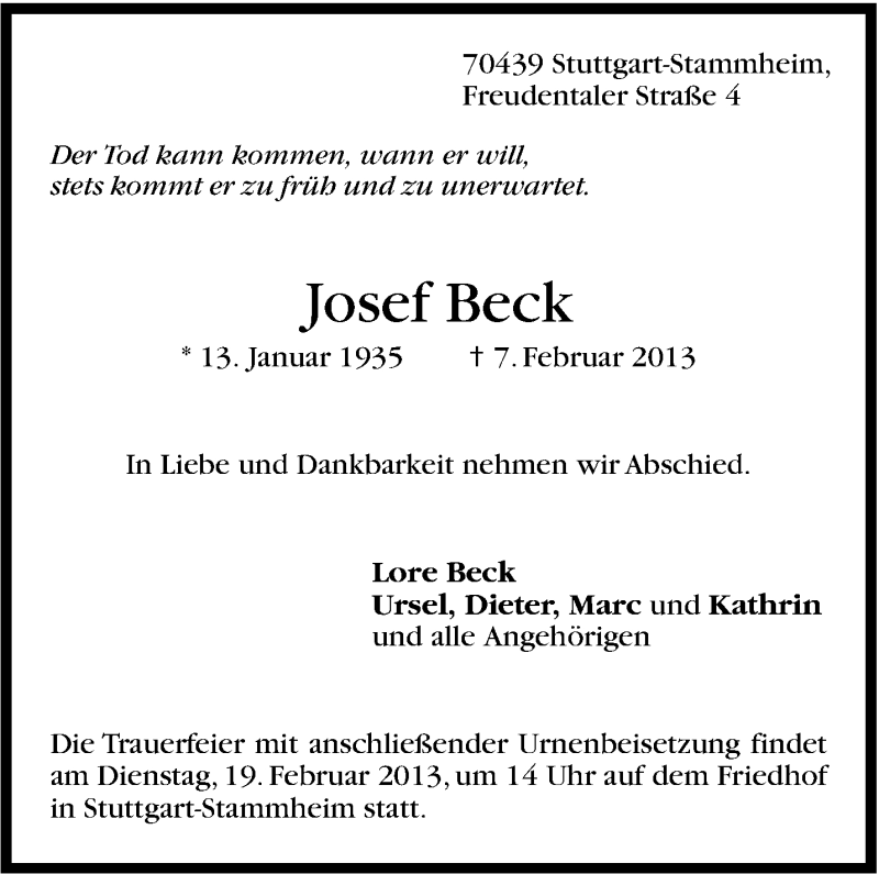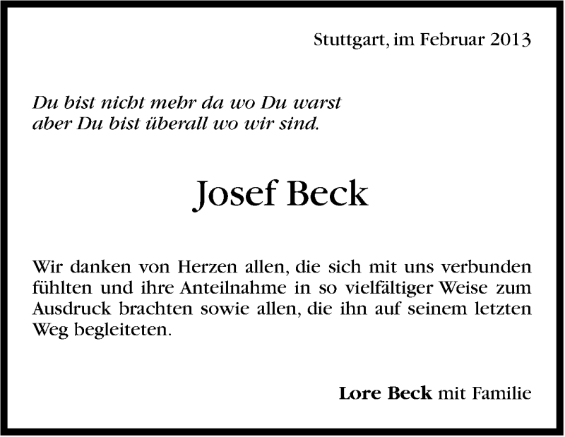 Hier finden Sie alle Traueranzeigen aus der Zeitung, die bisher für Josef Beck erschienen sind. Weitere Traueranzeigen, die in der Zeitung erscheinen, werden hier ebenfalls aufgelistet