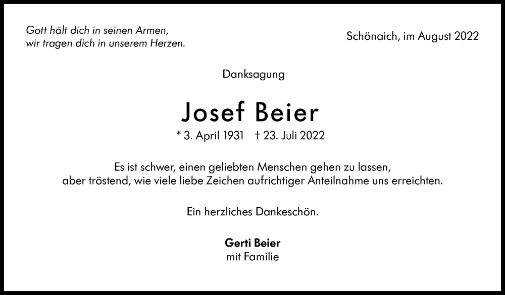 Hier finden Sie alle Traueranzeigen aus der Zeitung, die bisher für Josef Beier erschienen sind. Weitere Traueranzeigen, die in der Zeitung erscheinen, werden hier ebenfalls aufgelistet