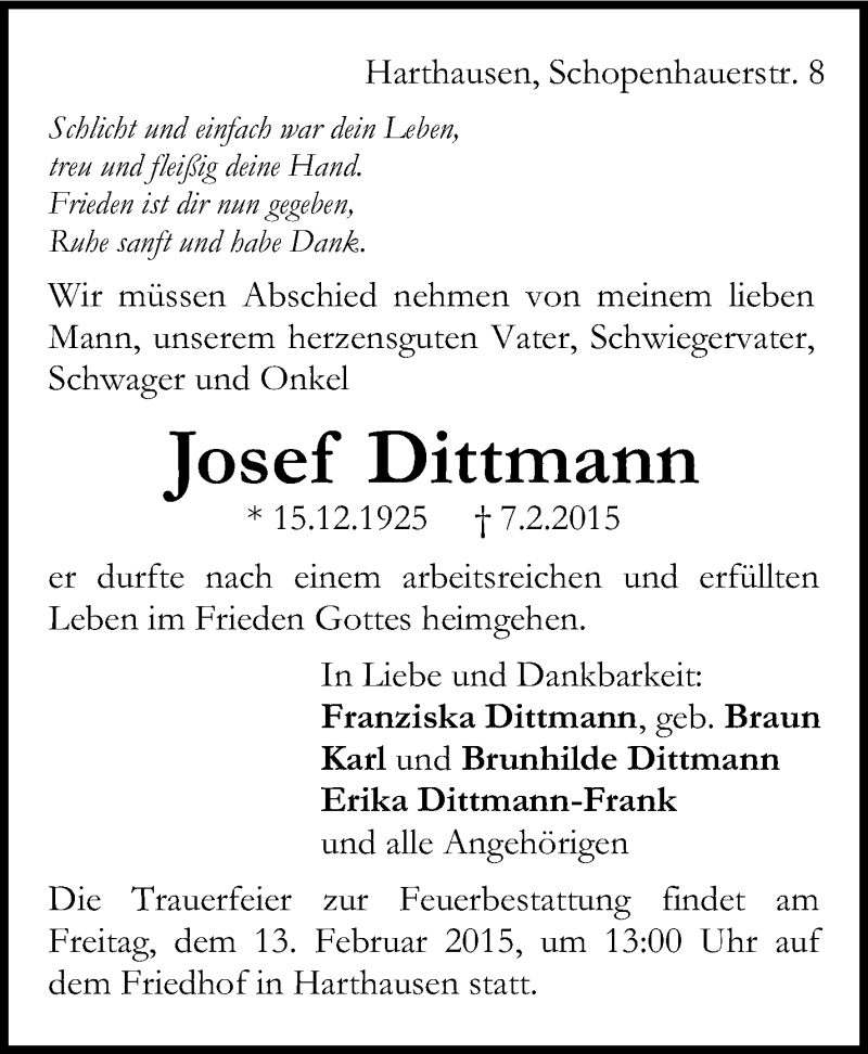 Hier finden Sie alle Traueranzeigen aus der Zeitung, die bisher für Josef Dittmann erschienen sind. Weitere Traueranzeigen, die in der Zeitung erscheinen, werden hier ebenfalls aufgelistet