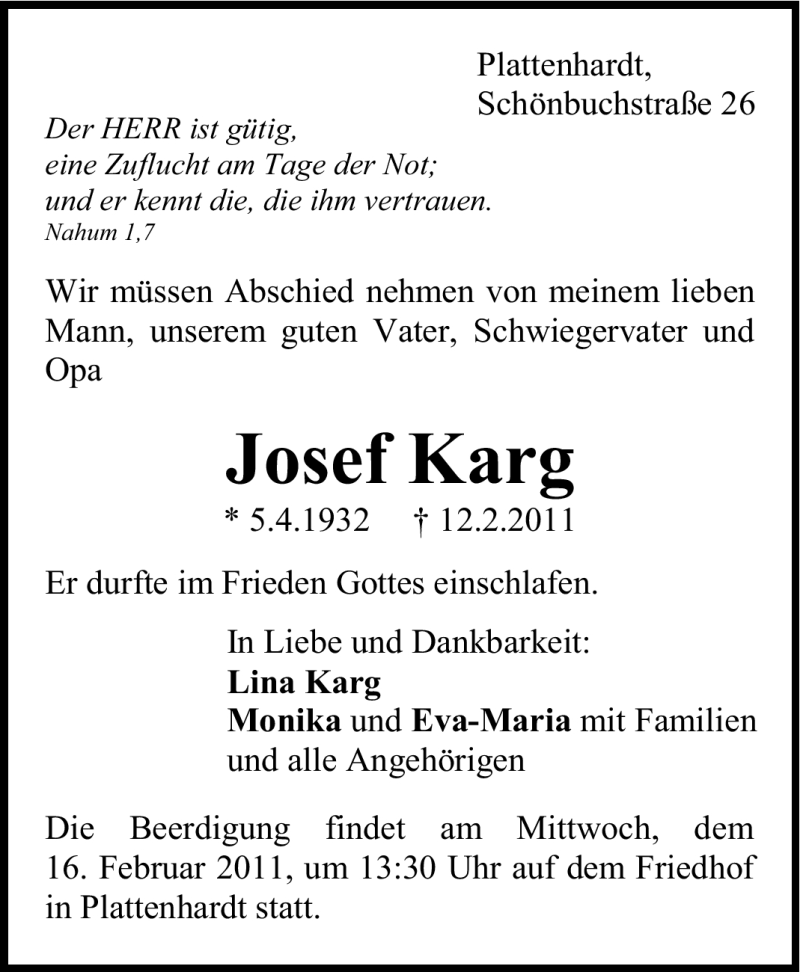 Hier finden Sie alle Traueranzeigen aus der Zeitung, die bisher für Josef Karg erschienen sind. Weitere Traueranzeigen, die in der Zeitung erscheinen, werden hier ebenfalls aufgelistet