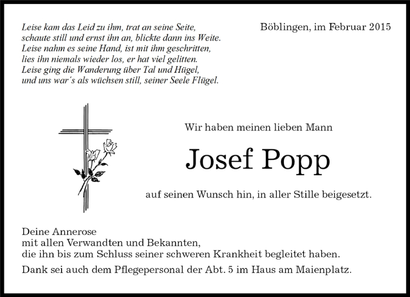Hier finden Sie alle Traueranzeigen aus der Zeitung, die bisher für Josef Popp erschienen sind. Weitere Traueranzeigen, die in der Zeitung erscheinen, werden hier ebenfalls aufgelistet