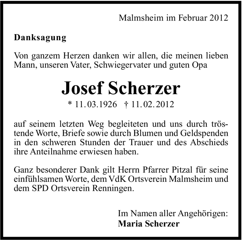 Hier finden Sie alle Traueranzeigen aus der Zeitung, die bisher für Josef Scherzer erschienen sind. Weitere Traueranzeigen, die in der Zeitung erscheinen, werden hier ebenfalls aufgelistet