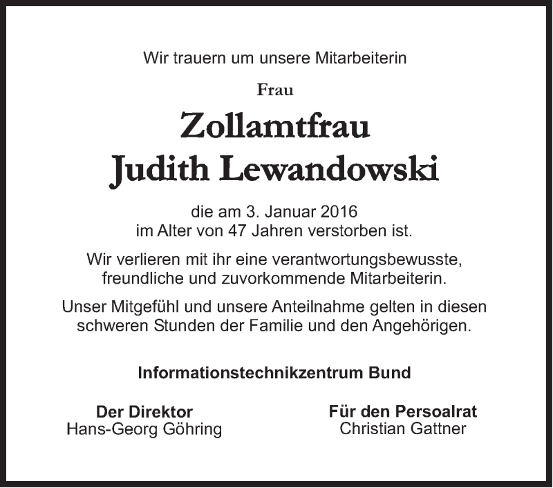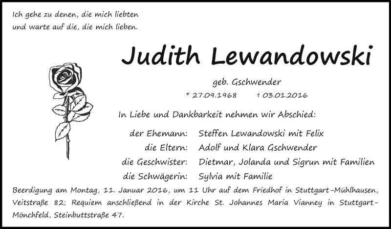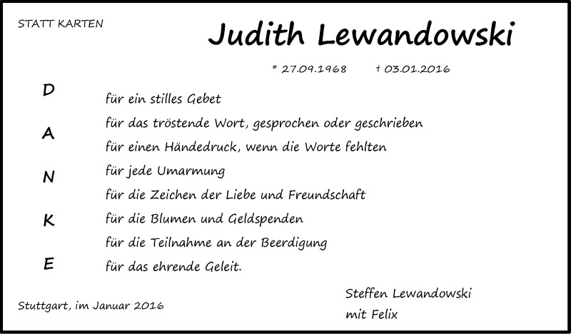 Hier finden Sie alle Traueranzeigen aus der Zeitung, die bisher für Judith Lewandowski erschienen sind. Weitere Traueranzeigen, die in der Zeitung erscheinen, werden hier ebenfalls aufgelistet