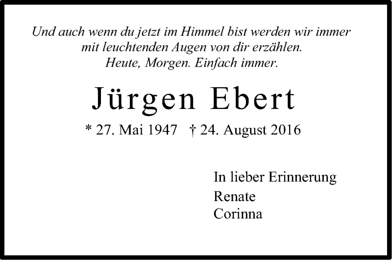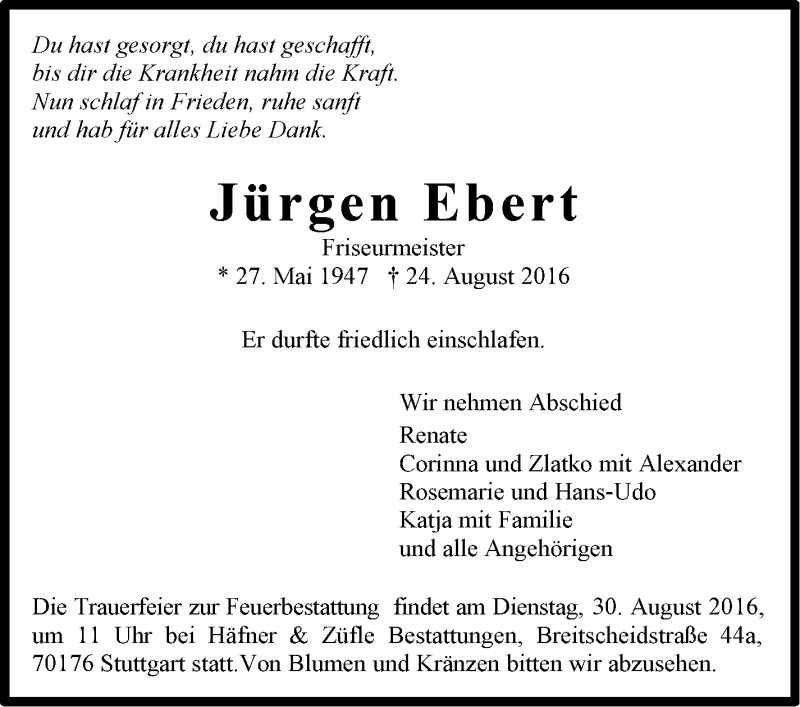 Hier finden Sie alle Traueranzeigen aus der Zeitung, die bisher für Jürgen Ebert erschienen sind. Weitere Traueranzeigen, die in der Zeitung erscheinen, werden hier ebenfalls aufgelistet
