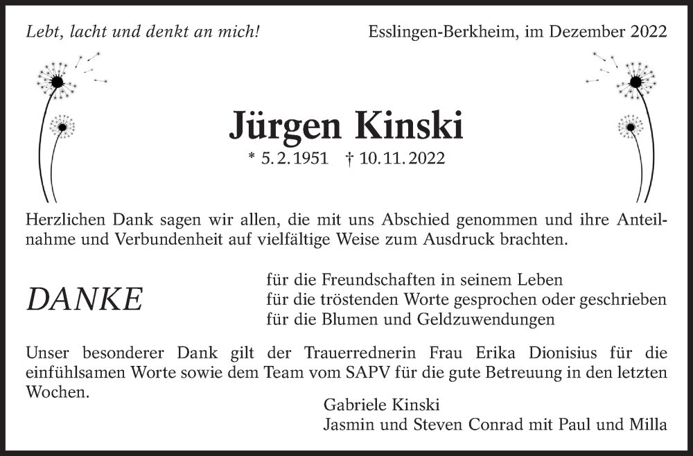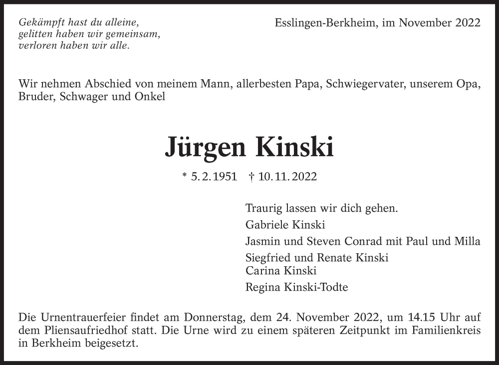 Hier finden Sie alle Traueranzeigen aus der Zeitung, die bisher für Jürgen Kinski erschienen sind. Weitere Traueranzeigen, die in der Zeitung erscheinen, werden hier ebenfalls aufgelistet