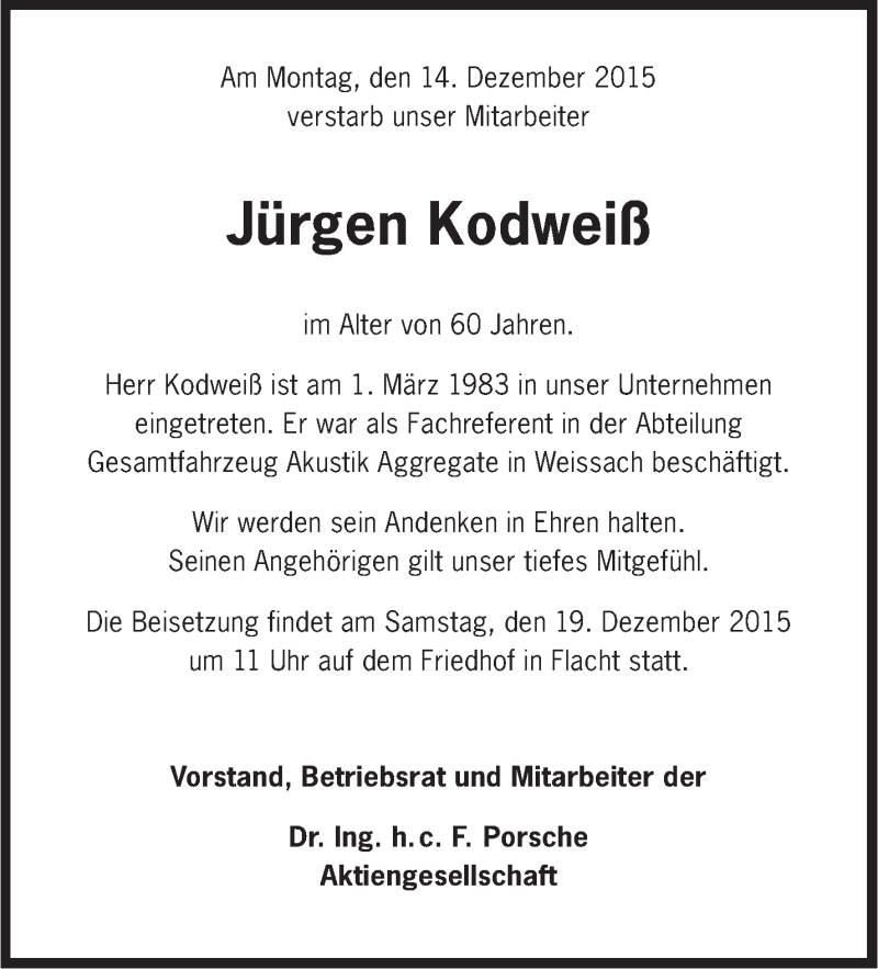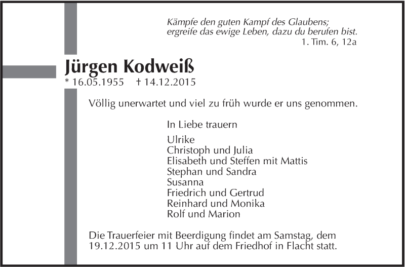 Hier finden Sie alle Traueranzeigen aus der Zeitung, die bisher für Jürgen Kodweiß erschienen sind. Weitere Traueranzeigen, die in der Zeitung erscheinen, werden hier ebenfalls aufgelistet