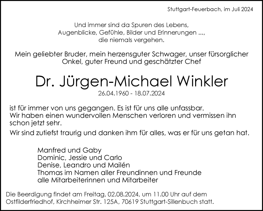 Hier finden Sie alle Traueranzeigen aus der Zeitung, die bisher für Jürgen-Michael Winkler erschienen sind. Weitere Traueranzeigen, die in der Zeitung erscheinen, werden hier ebenfalls aufgelistet
