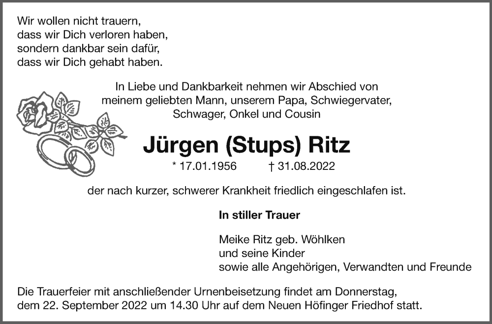 Hier finden Sie alle Traueranzeigen aus der Zeitung, die bisher für Jürgen Ritz erschienen sind. Weitere Traueranzeigen, die in der Zeitung erscheinen, werden hier ebenfalls aufgelistet