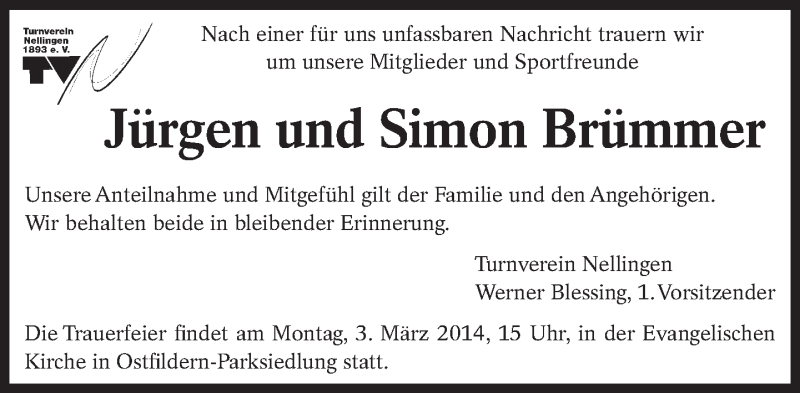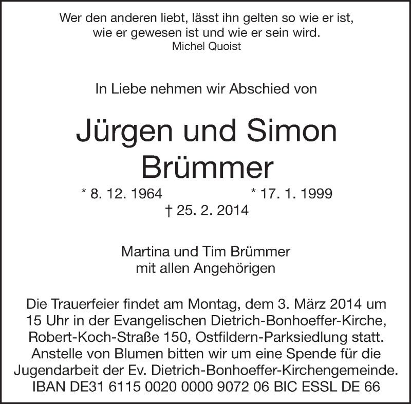 Hier finden Sie alle Traueranzeigen aus der Zeitung, die bisher für Jürgen und Simon Brümmer erschienen sind. Weitere Traueranzeigen, die in der Zeitung erscheinen, werden hier ebenfalls aufgelistet