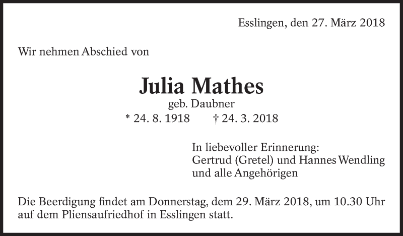 Hier finden Sie alle Traueranzeigen aus der Zeitung, die bisher für Julia Mathes erschienen sind. Weitere Traueranzeigen, die in der Zeitung erscheinen, werden hier ebenfalls aufgelistet