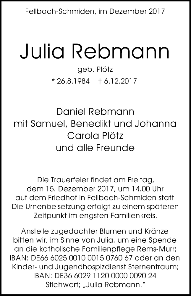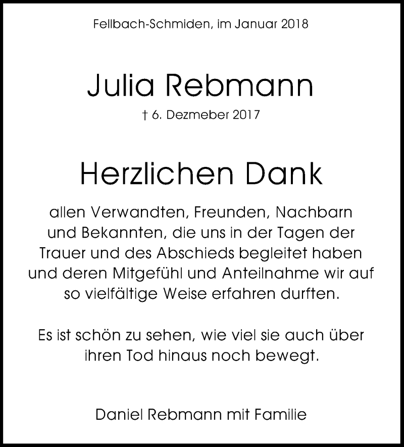 Hier finden Sie alle Traueranzeigen aus der Zeitung, die bisher für Julia Rebmann erschienen sind. Weitere Traueranzeigen, die in der Zeitung erscheinen, werden hier ebenfalls aufgelistet
