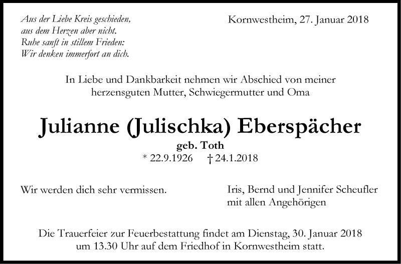 Hier finden Sie alle Traueranzeigen aus der Zeitung, die bisher für Julianne Eberspächer erschienen sind. Weitere Traueranzeigen, die in der Zeitung erscheinen, werden hier ebenfalls aufgelistet