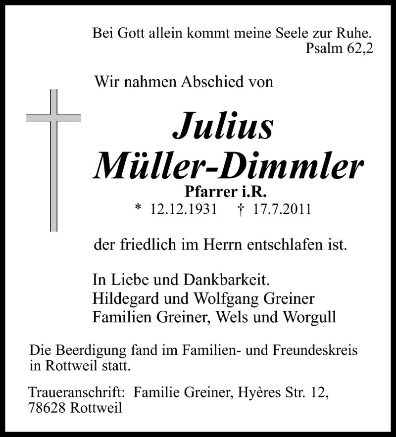 Hier finden Sie alle Traueranzeigen aus der Zeitung, die bisher für Julius Müller-Dimmler erschienen sind. Weitere Traueranzeigen, die in der Zeitung erscheinen, werden hier ebenfalls aufgelistet