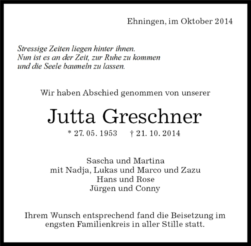 Hier finden Sie alle Traueranzeigen aus der Zeitung, die bisher für Jutta Greschner erschienen sind. Weitere Traueranzeigen, die in der Zeitung erscheinen, werden hier ebenfalls aufgelistet