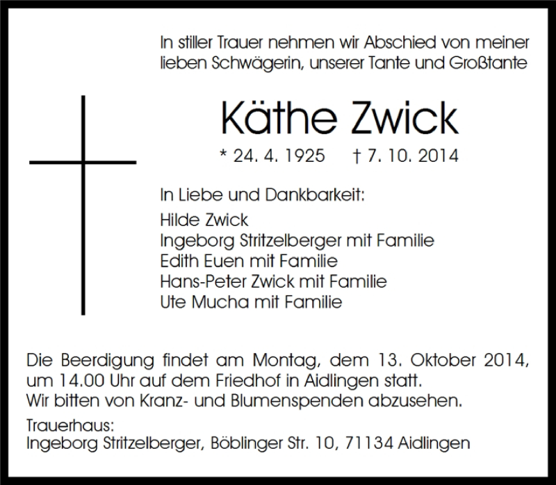 Hier finden Sie alle Traueranzeigen aus der Zeitung, die bisher für Käthe Zwick erschienen sind. Weitere Traueranzeigen, die in der Zeitung erscheinen, werden hier ebenfalls aufgelistet