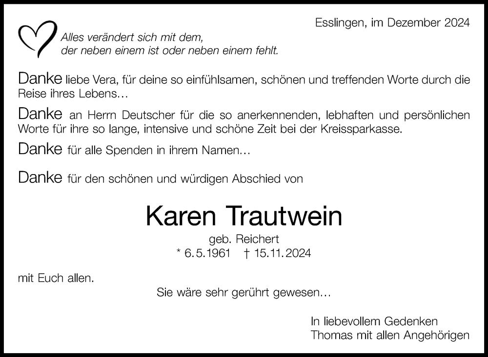 Hier finden Sie alle Traueranzeigen aus der Zeitung, die bisher für Karen Trautwein erschienen sind. Weitere Traueranzeigen, die in der Zeitung erscheinen, werden hier ebenfalls aufgelistet