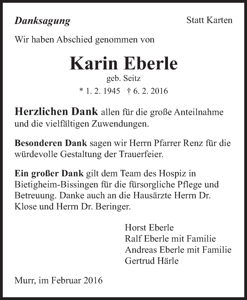 Hier finden Sie alle Traueranzeigen aus der Zeitung, die bisher für Karin Eberle erschienen sind. Weitere Traueranzeigen, die in der Zeitung erscheinen, werden hier ebenfalls aufgelistet