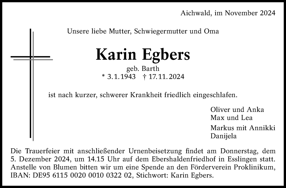 Hier finden Sie alle Traueranzeigen aus der Zeitung, die bisher für Karin Egbers erschienen sind. Weitere Traueranzeigen, die in der Zeitung erscheinen, werden hier ebenfalls aufgelistet
