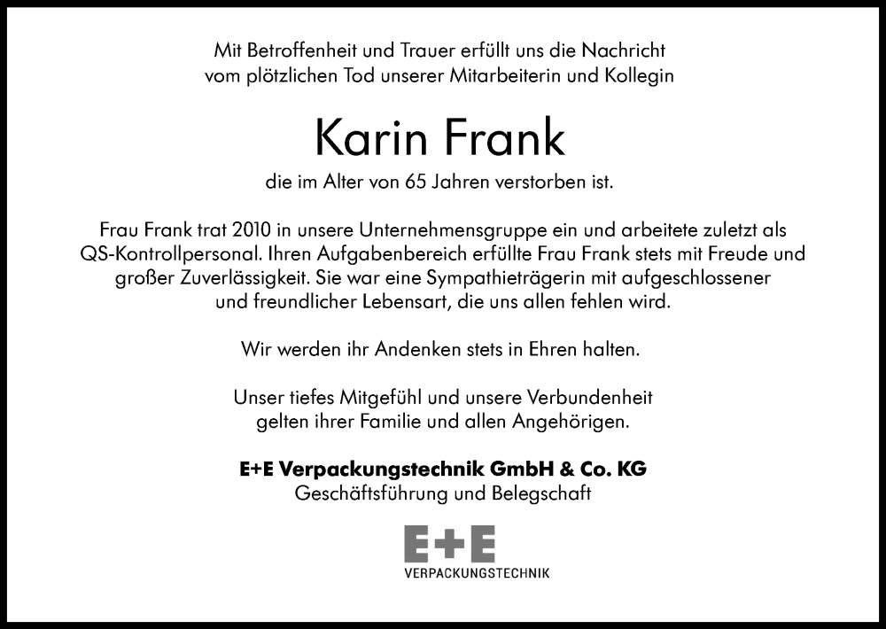 Hier finden Sie alle Traueranzeigen aus der Zeitung, die bisher für Karin Frank erschienen sind. Weitere Traueranzeigen, die in der Zeitung erscheinen, werden hier ebenfalls aufgelistet