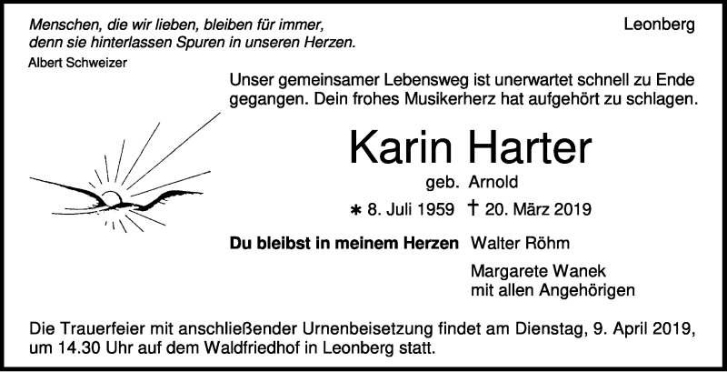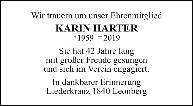 Hier finden Sie alle Traueranzeigen aus der Zeitung, die bisher für Karin Harter erschienen sind. Weitere Traueranzeigen, die in der Zeitung erscheinen, werden hier ebenfalls aufgelistet