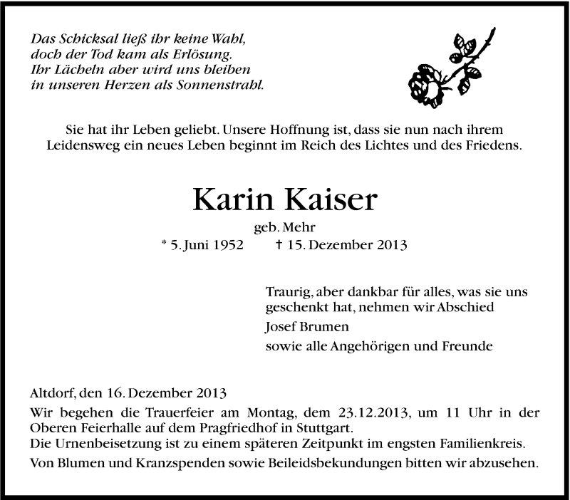 Hier finden Sie alle Traueranzeigen aus der Zeitung, die bisher für Karin Kaiser erschienen sind. Weitere Traueranzeigen, die in der Zeitung erscheinen, werden hier ebenfalls aufgelistet