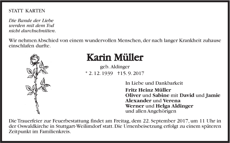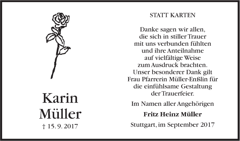 Hier finden Sie alle Traueranzeigen aus der Zeitung, die bisher für Karin Müller erschienen sind. Weitere Traueranzeigen, die in der Zeitung erscheinen, werden hier ebenfalls aufgelistet