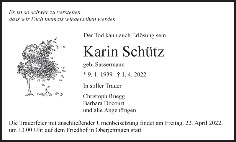 Hier finden Sie alle Traueranzeigen aus der Zeitung, die bisher für Karin Schütz erschienen sind. Weitere Traueranzeigen, die in der Zeitung erscheinen, werden hier ebenfalls aufgelistet