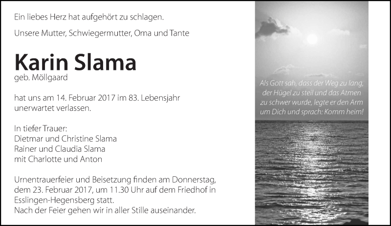 Hier finden Sie alle Traueranzeigen aus der Zeitung, die bisher für Karin Slama erschienen sind. Weitere Traueranzeigen, die in der Zeitung erscheinen, werden hier ebenfalls aufgelistet