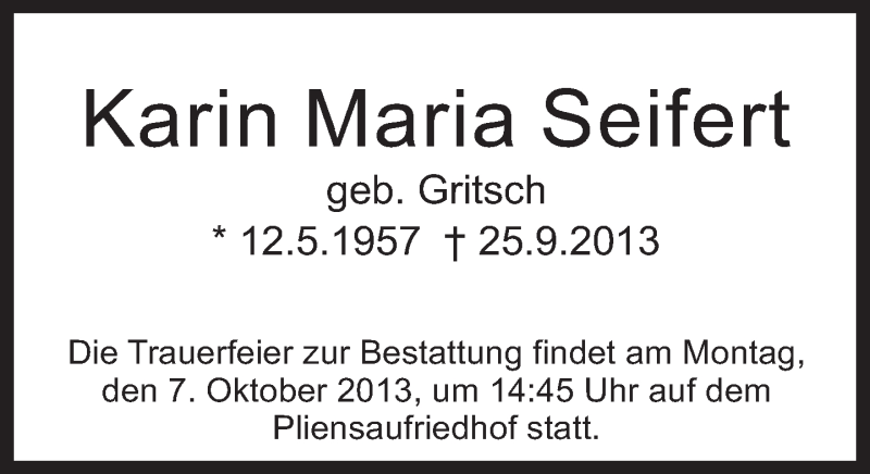 Hier finden Sie alle Traueranzeigen aus der Zeitung, die bisher für Karin Maria Seifert erschienen sind. Weitere Traueranzeigen, die in der Zeitung erscheinen, werden hier ebenfalls aufgelistet