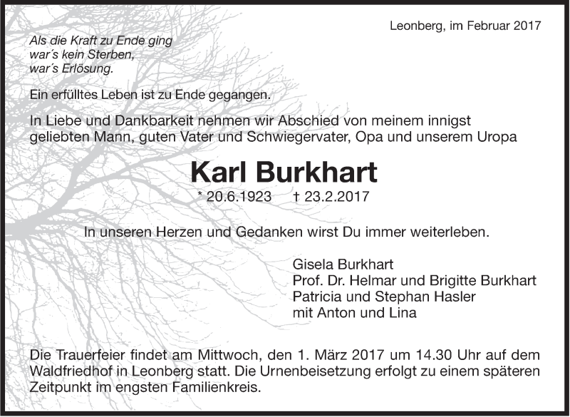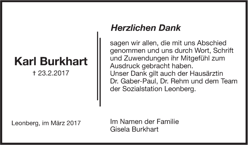 Hier finden Sie alle Traueranzeigen aus der Zeitung, die bisher für Karl Burkhart erschienen sind. Weitere Traueranzeigen, die in der Zeitung erscheinen, werden hier ebenfalls aufgelistet