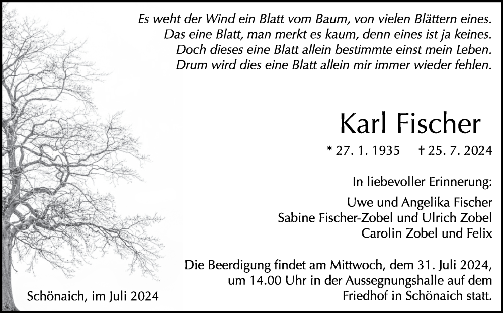 Hier finden Sie alle Traueranzeigen aus der Zeitung, die bisher für Karl Fischer erschienen sind. Weitere Traueranzeigen, die in der Zeitung erscheinen, werden hier ebenfalls aufgelistet