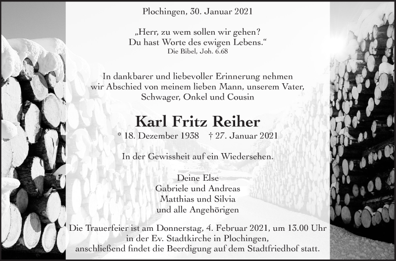 Hier finden Sie alle Traueranzeigen aus der Zeitung, die bisher für Karl Fritz Reiher erschienen sind. Weitere Traueranzeigen, die in der Zeitung erscheinen, werden hier ebenfalls aufgelistet