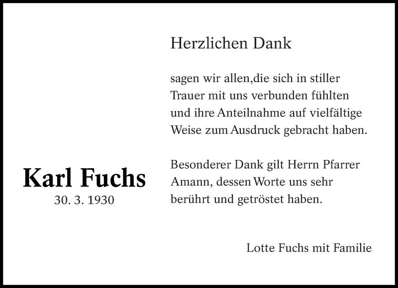 Hier finden Sie alle Traueranzeigen aus der Zeitung, die bisher für Karl Fuchs erschienen sind. Weitere Traueranzeigen, die in der Zeitung erscheinen, werden hier ebenfalls aufgelistet