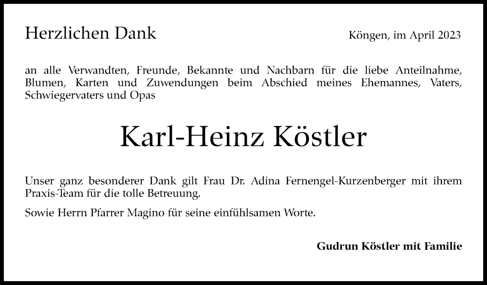Hier finden Sie alle Traueranzeigen aus der Zeitung, die bisher für Karl-Heinz Köstler erschienen sind. Weitere Traueranzeigen, die in der Zeitung erscheinen, werden hier ebenfalls aufgelistet