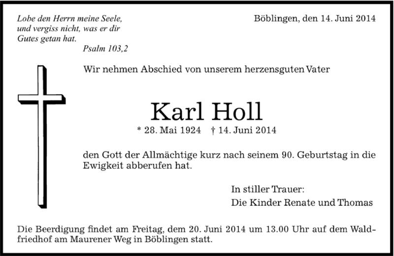 Hier finden Sie alle Traueranzeigen aus der Zeitung, die bisher für Karl Holl erschienen sind. Weitere Traueranzeigen, die in der Zeitung erscheinen, werden hier ebenfalls aufgelistet