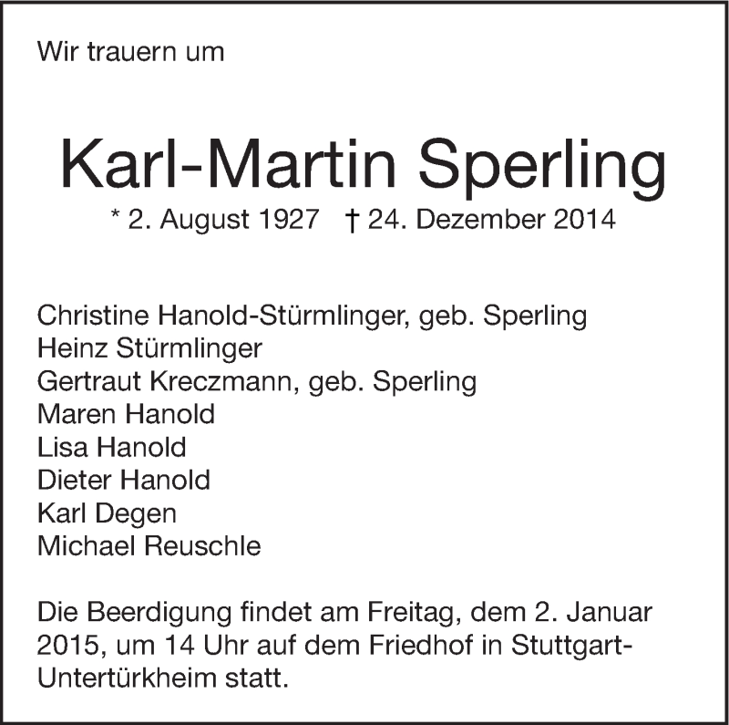 Hier finden Sie alle Traueranzeigen aus der Zeitung, die bisher für Karl-Martin Sperling erschienen sind. Weitere Traueranzeigen, die in der Zeitung erscheinen, werden hier ebenfalls aufgelistet