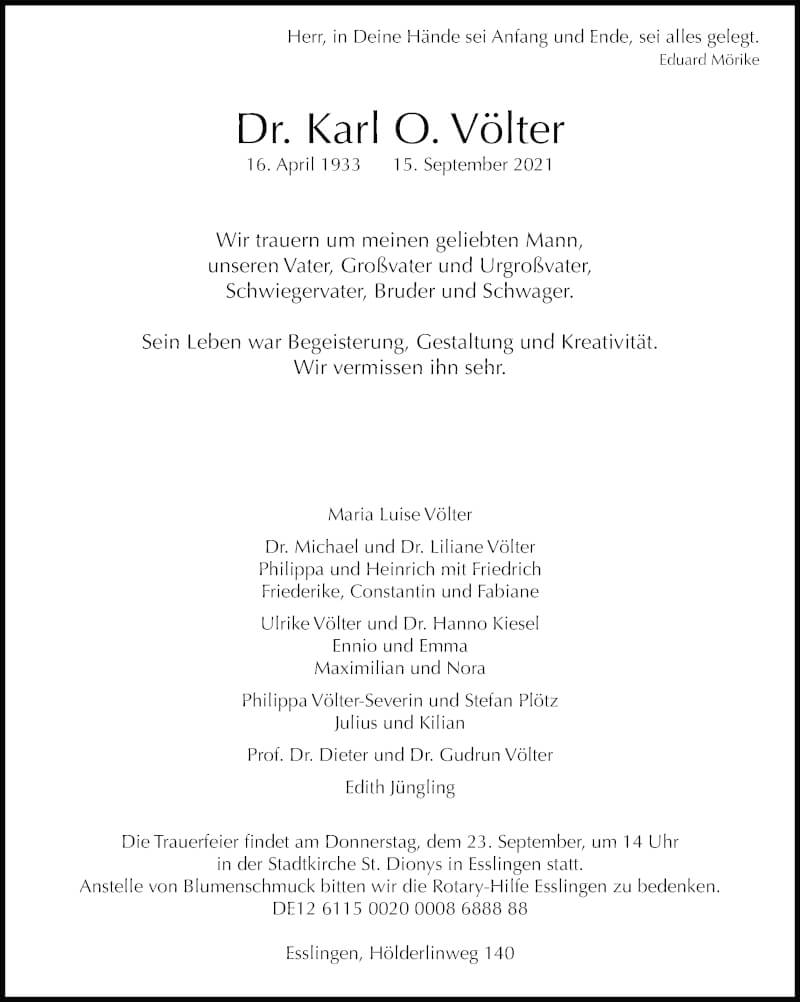 Hier finden Sie alle Traueranzeigen aus der Zeitung, die bisher für Karl O. Völter erschienen sind. Weitere Traueranzeigen, die in der Zeitung erscheinen, werden hier ebenfalls aufgelistet
